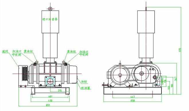 由尺寸漩渦風機和羅茨風機對比圖上可以看出,羅茨由于進氣消音筒和出氣消單筒及電機和泵體組裝位置的原因,它的整體的尺寸非常大,沒有漩渦風機這樣緊湊密實,相同功率下,整體尺寸相差有三分之一甚至是二分之一。